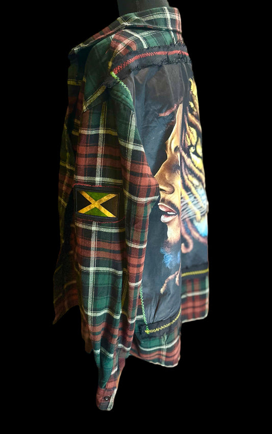 Customized “Bob Marley” Graphic Heavy Weight Flannel with Denim Patchwork